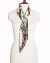 Chopard Silk Printed Panda Scarf. This scarf is rendered in a premium, high-luster silk, featuring a delicate light pink base. The design is defined by an elegant bamboo forest motif, showcasing vertical bamboo stalks in natural shades of tan and brown, accented by vibrant green leaves. This serene landscape serves as a home for a charming panda illustration, adding a playful yet sophisticated element to the piece.