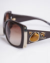 New Christian Dior Women’s Sunglasses, crafted in a rich brown acetate frame with statement gold-tone embellishments and signature Dior branding on the temples. The oversized square design offers both style and sun protection, while gradient brown lenses add a touch of sophistication. A perfect blend of luxury and glamour, these sunglasses are an essential accessory for any fashion-forward wardrobe.