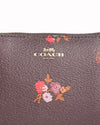Coach Floral Printed Leather Zip Wristlet Walletis rendered in premium dark brown pebbled leather. The design is defined by its vibrant floral print, showcasing delicate clusters of pink, red, and orange blossoms scattered across the exterior. A standout feature is the polished gold-tone Coach horse and carriage logo centered on the front, providing a classic mark of the brand's heritage. Finished with a secure top-zip closure and an integrated leather wrist strap.