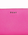 DKNY Zip Around Wallet in Pink is rendered in a premium hot pink Saffiano leather. A standout feature is the minimalist silver-tone DKNY logo hardware prominently displayed at the top center, offering a touch of polished designer flair. Finished with a coordinated leather wristlet strap featuring a decorative metallic logo charm.