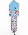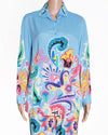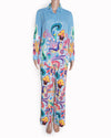 Etro Printed Co-ord Set embodies the brand's maximalist approach to pattern and color. The set consists of matching trousers and a top crafted from a luxurious, lightweight fabric in a brilliant Sky Blue. It features an all-over, intricate Paisley and Baroque-inspired print in a rich, vibrant palette of red, yellow, pink, and dark blue swirls.