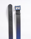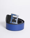 This new Fendi leather belt is a refined statement piece that seamlessly blends luxury and versatility. Crafted from premium leather, it features a reversible design with classic black on one side and rich blue on the other, allowing for adaptable styling. The centerpiece is the iconic FF logo buckle, rendered in a polished silver-tone finish with striking navy blue enamel detailing, adding a modern, sophisticated touch. Whether paired with casual attire or formal wear, this belt elevates any look with its bold branding and timeless design.