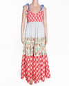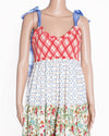 Free People Bluebell Maxi Dress is a charming and effortlessly bohemian piece, perfect for sunny days and festivals. The dress features a fun, tiered, and flowing maxi silhouette constructed from various printed fabrics, giving it a playful, patchwork aesthetic. The design includes sections of red and white check, a delicate blue and cream floral print, and another panel of a small red and green floral pattern. The top bodice features a ruffled neckline with thin straps, beautifully accented by bold light blue satin ribbon ties on the shoulders, which add a whimsical, customizable detail.