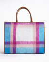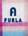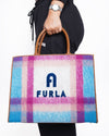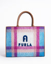 New Furla Opportunity Tote is a perfect blend of modern design and classic pattern. The bag is crafted from a durable fabric, featuring a beautiful multicolour checkered pattern in shades of blue, red, and beige. The large 'FURLA' logo is prominently displayed in blue on the front. It has a structured, rectangular silhouette with dual leather top handles