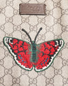 Gucci GG Supreme Embroidery Tote Bag is rendered in the signature GG Supreme coated canvas in a classic beige and ebony colorway. The design is defined by its vibrant, high-relief floral and butterfly embroidery prominently featured on the front. These meticulously stitched patches include a central red and green butterfly flanked by two large, symmetrical floral arrangements in shades of orange, pink, and emerald green, adding a tactile and artistic dimension to the structured silhouette. Finished with premium dark brown leather trim, dual top handles, and an adjustable, detachable leather shoulder strap.