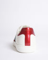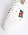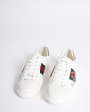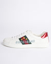 The New Gucci White Leather Gucci Band Embroidery Ace Sneakers blend luxury craftsmanship with bold street-style flair. Made from premium white leather, these sneakers feature Gucci's signature green and red web stripe on the side, overlaid with a striking "GUCCIBAND" embroidery and star motifs that evoke a vintage athletic aesthetic. The design is completed with a clean rubber sole and the iconic red metallic heel tab, offering both comfort and standout appeal. Perfect for elevating casual outfits, these sneakers showcase Gucci’s distinctive approach to contemporary fashion with a nod to heritage branding.