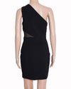 Halston Heritage Dress is meticulously crafted from a premium black stretch-fabric, offering a smooth, structured fit that beautifully contours the natural form. The design is defined by its striking one-shoulder asymmetric neckline, featuring a soft diagonal drape across the bodice that adds a sense of fluid movement to the minimalist silhouette.
