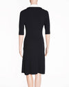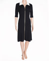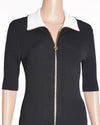 Maje Knitted Zip Up Dress in classic black, perfect for a chic and effortless look. The dress is crafted from a comfortable, structured ribbed knit fabric that offers a flattering bodycon silhouette. The design is modernized by a striking gold-toned zipper that runs diagonally from the neckline down the front, cinching at a central point and adding an edgy detail. The contrasting white inner trim on the collar.