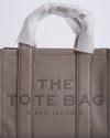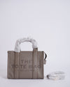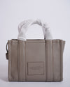 Marc Jacobs Leather Medium Tote Bag in a chic grey hue. This versatile tote features a structured, rectangular silhouette crafted from leather, embossed with "THE TOTE BAG MARC JACOBS" on the front, making a bold yet minimalist statement. It comes with comfortable top handles, still in their protective wrapping, and a detachable, adjustable shoulder strap for versatile carry options.
