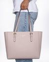 Michael Kors Jet Set Tote Bag is a perfect blend of style and everyday practicality. The bag is crafted from a durable Saffiano leather in a beautiful, blush pink. It features a structured, tote silhouette with a secure top closure and two top handles. A polished gold-tone 'MICHAEL KORS' logo on the front adds a touch of signature luxury.