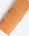 Montblanc Pen Pouch is meticulously crafted from premium tan calfskin leather, offering a smooth, durable finish that will age beautifully. The design features a secure fold-over flap closure that tucks into a matching leather loop, which is elegantly embossed with the "MONTBLANC" block logo. Designed for refined protection, the case is finished with contrasting yellow stitching that highlights its structural integrity and artisanal quality.