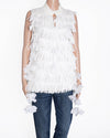 Noie Noie Mini Fringe Top is a playful, high-impact statement piece designed to turn heads. Crafted from tiers of dynamic, densely layered white fringe, this sleeveless top creates incredible texture and movement. The top features a pleated neckline and a simple, boxy silhouette that allows the dramatic cascading fringe to take center stage.
