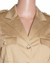 Ralph Lauren shirt is a stylish and functional piece that channels a classic safari aesthetic. The versatile beige shirt features a button-down front, a classic collar, and four front flap pockets with button closures. Button-tab details on the shoulders and a matching fabric belt allow for a tailored, polished silhouette. The short sleeves make it perfect for warmer weather.