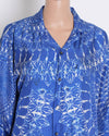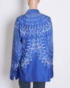 Rohit Gandhi & Rahul Khanna Stellar Printed Shirt with a long-sleeved, relaxed fit and a Cuban or camp collar. The shirt is crafted from a fluid, silky fabric in a striking deep blue color. It features an eye-catching, all-over print of white geometric, star-like, or intricate mandala patterns. The white graphic appears to fade toward the bottom, giving the shirt a dynamic and artistic look.