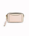 Marc Jacobs Snapshot Crossbody Bag in Beige is rendered in premium beige Saffiano leather. he design is defined by its structured, rectangular profile and high-contrast accents, including a soft pink leather zipper pulls, and taupe side panel. A standout feature is the oversized gold-tone "Double J" hardware prominently displayed at the center, serving as a definitive mark of Marc Jacobs' contemporary luxury aesthetic.