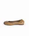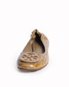 Tory Burch Reva Ballet Flats are a sophisticated take on a brand classic, blending effortless comfort with an exotic, high-fashion finish. These flats are rendered in a beige embossed leather. The design is defined by its versatile, scrunch-back silhouette, which includes an elasticated heel for a secure and flexible fit. A standout feature is the oversized leather-covered logo medallion on the toe, meticulously stitched to showcase the iconic interlocking "T" in a tonal finish.