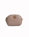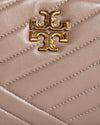 Tory Burch Kira Quilted Crossbody Bag is rendered in premium chevron-quilted leather in a versatile brown hue. A standout feature is the iconic gold-tone Double T hardware prominently centered on the front, serving as a definitive mark of Tory Burch's luxury heritage. Finished with a coordinated leather-and-chain crossbody strap.