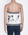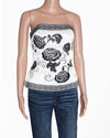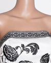 White House Black Market Strapless Top is an elegant and sophisticated piece perfect for evening wear. The top is crafted from a smooth, luxurious satin-like fabric in an white hue. The design is beautifully detailed with bold black floral embroidery in large rose motifs and intricate scrolling patterns across the bodice. The top features a flattering strapless, corset-style silhouette and a contrasting black and white patterned border along the hem and neckline, adding a sophisticated frame to the design.