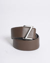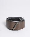 This Z Zegna reversible belt offers versatility with its rich brown hue on one side. The leather strap suggests quality craftsmanship and durability. The buckle appears to have a modern, matal finish, complementing the overall understated elegance of the belt. Being reversible, it likely features a different color or texture on the other side, providing multiple styling options. This belt embodies Z Zegna's contemporary approach to menswear, blending practicality with subtle sophistication.