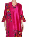Niti Bothra Pink Floral Applique Sharara Set is rendered in a premium hot pink silk base, offering a rich, lustrous finish that serves as a bold canvas for its intricate decorative elements. The design is defined by its elaborate floral applique work, featuring oversized blooms and verdant leaf motifs in shades of marigold orange, violet, and forest green. These hand-applied accents are meticulously placed along the hem of the kurta, the voluminous flare of the sharara pants, and the borders of the dupatta.
