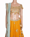 Osaa by Adarsh Orange Peel Embroidered Lehenga is rendered in a striking orange peel hue. The design is defined by its intricate gold zardosi and threadwork embroidery, which adorns the hem of the voluminous skirt in a dense, scalloped floral pattern. A standout feature is the heavily embellished blouse (choli), featuring a modern square neckline and delicate dangling bead droplets at the waist for a touch of contemporary movement. Finished with a contrasting mint blue sheer dupatta