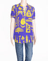 Pankaj & Nidhi Printed Button Down Women’s Top lightweight women's top is designed in a classic button-down silhouette featuring a striking all-over print of various musical instruments in a bold yellow hue against a rich purple background. Crafted for a relaxed fit, this short-sleeve shirt offers an eclectic, artistic statement piece suitable for both casual wear and unique layered looks.