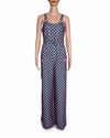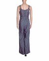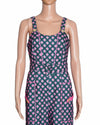 Papa Don't Preach X Garfield Printed Jumpsuit is rendered in a premium fabric featuring a vibrant geometric floral and Garfield motif. The design is defined by its bold, wide-leg silhouette, creating a statuesque and retro-inspired profile that is perfect for making a grand entrance. A standout feature is the vibrant pink contrast detailing, seen in the piping along the bodice and the decorative pocket flaps, which perfectly complements the deep teal and coral-pink print. Finished with signature branded gold-tone buttons on the straps and pocket.