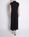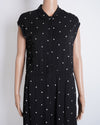Payal Pratap Polka Dot Jumpsuit. This chic piece, appearing as a Jumpsuit, features a classic black base adorned with charming white polka dots and two back pockets, creating a timeless and elegant pattern. The design includes a flattering v-neckline with a unique peter pan collar and a cinched waist, flowing into a comfortable and stylish wide-leg silhouette
