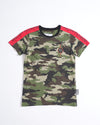 Philipp Plein Kids Camouflage Printed T-shirt for boys. This cool tee features a classic military camouflage print, beautifully contrasted by vibrant red stripes with black lettering on the shoulders, and a unique circular logo on the chest. Crafted from a soft, comfortable fabric, it's perfect for everyday wear, providing both a relaxed fit and an undeniably fashionable aesthetic.