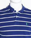 Polo by Ralph Lauren Polo T-shirt is a classic and versatile staple for any casual wardrobe. The shirt is crafted from a soft cotton blend and features a vibrant navy blue body with horizontal white stripes, offering a timeless, preppy look. The classic polo silhouette includes a ribbed collar, a two-button placket, and a short-sleeve design. A subtle yet iconic touch of designer heritage is provided by the embroidered green Pony logo on the chest.