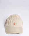 Classic Polo Men's Cap. This casual cap features a soft, light-colored fabric (possibly beige or light khaki) with a slightly worn or relaxed texture, giving it a comfortable, lived-in feel. The iconic Polo Ralph Lauren embroidered logo is visible in a contrasting red on the side, adding a touch of signature style. The cap's design is simple and versatile, making it a great accessory for everyday wear. The adjustable strap at the back ensures a customizable fit.