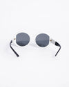 Prada Black & White Frame Sunglasses. These statement sunglasses feature a bold, oversized round frame in classic black & white, exuding a timeless sophistication. The thick frames and dark lenses offer both a glamorous look and excellent sun protection. The arms are subtly detailed with the Prada logo, a hallmark of the brand's quiet luxury.