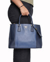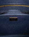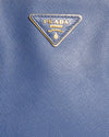 Prada Blue Saffiano Leather Lux Tote is rendered in the brand's iconic Saffiano leather. A standout feature is the triangular Prada logo plaque in tonal blue leather with gold-tone lettering, positioned elegantly at the top center. Finished with dual rolled top handles and a detachable, adjustable shoulder strap.