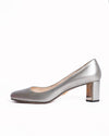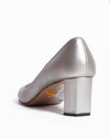Prada Metallic Block-Heel Pumps are expertly crafted from premium silver-toned metallic leather, known for its subtle luster and soft, durable finish. The design features a classic almond-toe silhouette and a sophisticated, medium-height block heel that provides both height and stability.