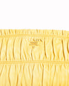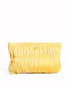 Prada Clutch is expertly crafted from incredibly soft yellow Nappa leather. The bag features the signature Gaufre technique, which creates a unique, gathered texture across the entire body of the clutch. The design is accented with the polished gold-tone Prada Milano logo lettering on the front. Its elongated, "pouch" style silhouette offers a modern look with ample space for essentials.