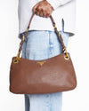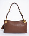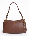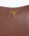 Prada Small Shoulder Bag, crafted from luxurious Vitello Daino Pebbled Leather in a rich Dark Brown hue. The bag features a classic, compact hobo or baguette silhouette with a secure zip-top closure. The leather is highly durable and supple, allowing for a relaxed structure. The design is accented with polished gold-toned hardware and the prominent PRADA Milano logo stamped in gold lettering on the front.
