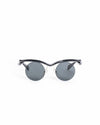 Prada Women's Round Cat-Eye Hybrid Sunglasses, these frames feature a striking polished black acetate brow bar in a dramatic cat-eye silhouette, seamlessly integrated with rimless round lenses. The contrast between the bold, structured top and the fluid, circular lenses creates a high-fashion, futuristic aesthetic that is quintessentially Prada. Equipped with premium dark charcoal lenses.