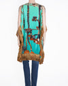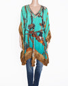 Pria Kataaria Puri Kaftan or Tunic Top is the epitome of luxurious resort wear, perfect for glamorous holiday dressing. Crafted from lightweight, flowing fabric, the piece features a vibrant, eye-catching digital print here, a bold motif of ropes clinched to waist set against a brilliant turquoise background. The wide, relaxed silhouette and dramatic details are signatures of the designer. The V-neckline is often embellished with shimmering sequin .