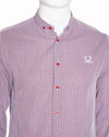 Raf Simons x Fred Perry Long-Sleeve Shirt is rendered in a vibrant red and white micro-check pattern. The design is defined by its contemporary slim-line silhouette and a minimalist button-down collar. A standout feature is the contrasting bright red buttons along the front placket and collar, which provide a sharp, energetic accent against the patterned fabric. The piece is finished with the reimagined white Laurel Wreath logo embroidered on the left chest, a signature hallmark of this coveted partnership.