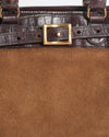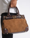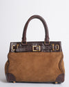This Ralph Lauren brown shoulder bag exudes timeless elegance with its rich combination of textured suede and embossed leather accents. The structured silhouette is complemented by gold-tone hardware, including a statement buckle and corner studs that add a touch of sophistication. Its deep brown leather handles and trim give it a luxurious, vintage-inspired appeal, perfect for elevating both casual and formal outfits. A classic piece, it reflects Ralph Lauren’s signature blend of refined American style and high-quality craftsmanship