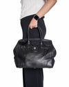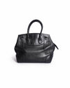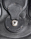 Ralph Lauren Collection Ricky Tote Bag is rendered in premium Italian calfskin leather in a deep midnight black. A standout feature is the hand-stitched leather detailing and the polished silver-tone custom hardware, including the iconic circular slide-lock closure and decorative side buckles that provide a sophisticated, industrial edge. Finished with dual rolled leather top handles and a discreet silver foil-stamped logo.