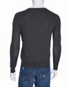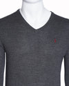 Ralph Lauren V-Neck Sweater crafted from a soft, lightweight grey heather knit. This pullover features long sleeves and a ribbed V-neck, cuffs, and hem. It is subtly finished with the iconic Ralph Lauren Polo Player logo embroidered on the chest in a contrasting color red.