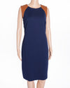 Ralph Lauren Blue A-Line Dress. This chic sleeveless dress features a flattering A-line silhouette in a versatile navy blue hue, beautifully contrasted by brown panels on the shoulders, adding a subtle color-block effect.