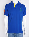 Ralph Lauren Royal Blue Half Sleeve Polo T-shirt for men. This eye-catching polo features a cheerful royal blue hue and is prominently embroidered with the iconic oversized polo pony logo in a contrasting bold neon green. The classic polo collar and button placket in yellow provide a refined look, shirt sleeve featuring a large, orange embroidered number “3” with a orange outline. perfect for both daywear and smart-casual outings.