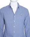 Ralph Lauren Check Button-Down Shirt is a quintessential wardrobe staple that embodies the brand's heritage of classic American sportswear. This long-sleeved shirt is rendered in a crisp blue and white gingham pattern. The design is defined by its meticulous construction, featuring a button-down collar and a standard button-front placket with white tonal buttons. A hallmark of the brand's luxury status, the shirt is finished with the iconic Pony motif embroidered in a contrasting tan or golden-brown thread on the left chest.