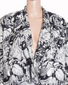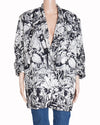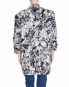 Reik Jacket is expertly crafted from a high-quality lightweight technical fabric, offering a smooth, breathable finish with a sharp, structured drape. The garment is defined by its dramatic all-over safari print, a monochromatic masterpiece featuring detailed illustrations of tigers, toucans, and lush tropical foliage. The jacket features an oversized "Zoot" silhouette with dropped shoulders and wide, relaxed sleeves that lend a modern, architectural feel to the look.