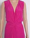 Reiss Gathered Detailing Pink Dress. This eye-catching sleeveless midi dress features a stunning hot pink hue.The design is elegantly complemented by a flattering V-neckline and a distinctive twisted detail at the waist, which creates a beautiful draped silhouette.