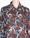 Reiss Slim Fit Abstract Print Shirt, perfect for adding a pop of color to your wardrobe. The shirt is set on a sophisticated brown base, featuring an all-over abstract design reminiscent of Bird of Paradise leaves in vibrant shades of coral, bright blue, and white.