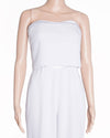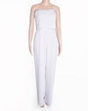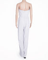 Reiss Strapless Jumpsuit in a sophisticated Light Grey hue. The jumpsuit features a clean, structured strapless bodice with a neatly folded band neckline, offering an elegant foundation. The lower half is characterized by a fluid, wide-leg trouser silhouette that drapes beautifully from the defined waistline.