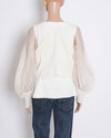 Renasci by Ritika Arya Jain White Top is crafted from a crisp white fabric with contrasting sheer organza balloon sleeves. It features a V-neckline and is distinguished by the large, pleated fabric bow detail at the center of the bodice.